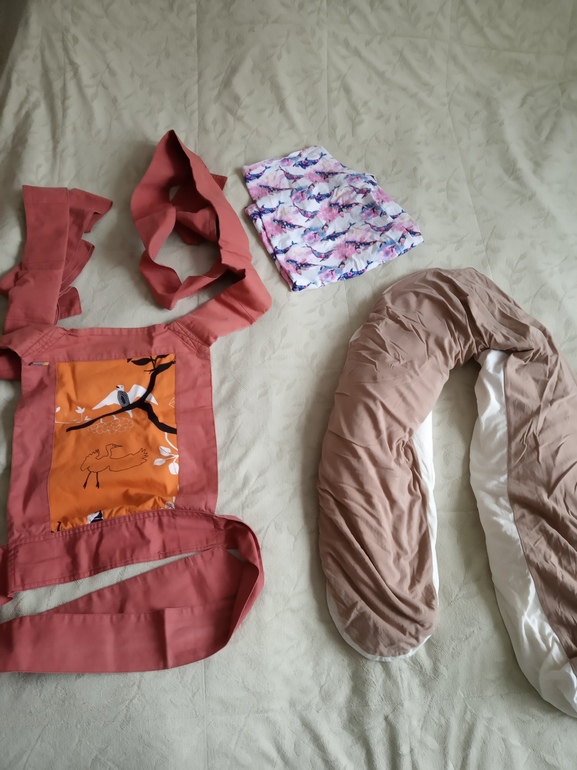 Подушка-банан, банан правда худенький. Май-слинг, снуд для кормления или как эта штука называется, можно одевать на коляску от ветра или когда кормишь