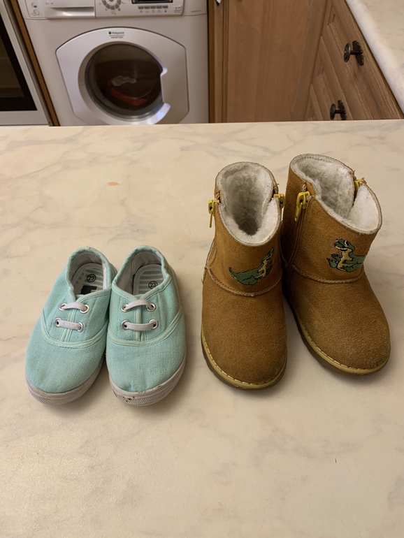 Отдам даром. В хорошем состоянии. Угги очень теплые, с двумя молниями, хорошо на первую ходячую зиму, мягкие и широкие. Кедики мягкие, резинки вместо шнурков, хорошо на широкую ножку. Всё чистое, кеды после стирки в стиралке, но на одном кедике несколько точечек от смолы, которые не выводятся ;(