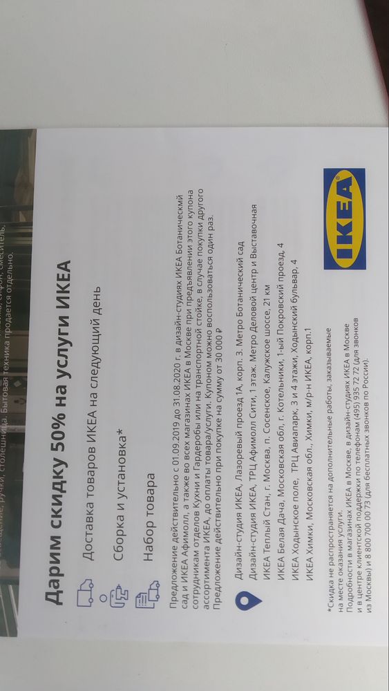 Услуги в дарОтдам талон на скидку ИКЕА на доставку и сборку товара. Купон до 31 августа 2020г. Давали новоселам группа ПИК. Самовывоз м.Пражская