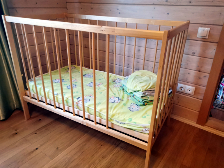 Состояние хорошее, но т.к. стенка не снимается, когда ребенок подрос, мы выпилили 2 прута. Можно поставить этой стороной к стене.