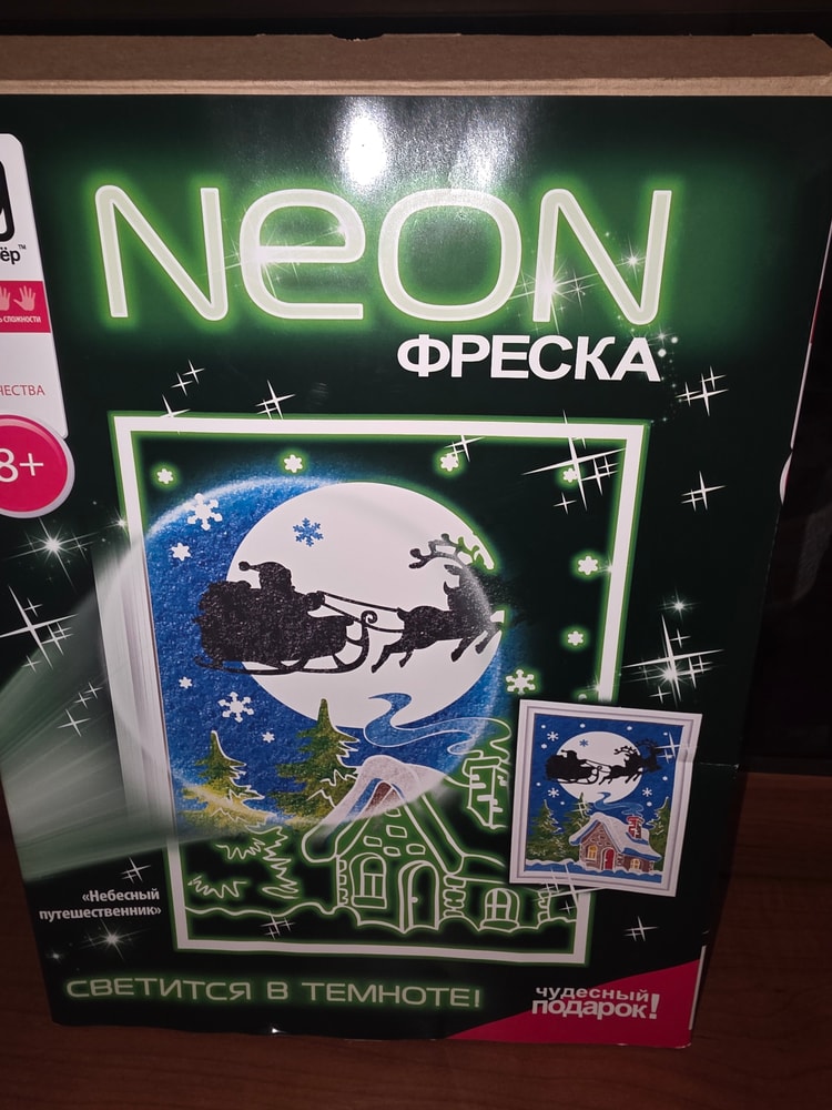 На первом фото неоновая картина, светящегося порошка нет, приобреталась только из-за него.
