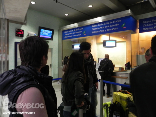 Мы изначально неправильно рассчитали время выхода из дома и еще задержались немного.Не буду пересказывать как мы добирались до аэропорта, но надежда, что мы успеем на самолет почти пропала. С экспресса мы выбежали в тот момент, когда закончилась регистрация. Добежав до регистрации и просунувшись вперед толпы нас смогли зарегистрировать, багаж, разумеется, с собой. Т. е. Если бы мы были с чемоданом, то нам бы не разрешили его в салон взять. Потом нас несколько раз просили срочно пройти на посадку, потому что муж никак не мог пройти досмотр...))))И вот мы в самолете. Почти всю дорогу в себя приходила. Париж. Подготовилась я основательно. Сразу нашли, где купить билеты на электричку.