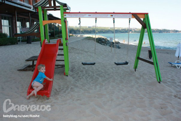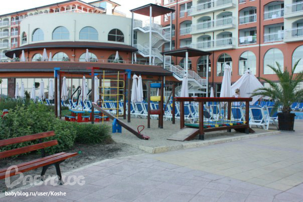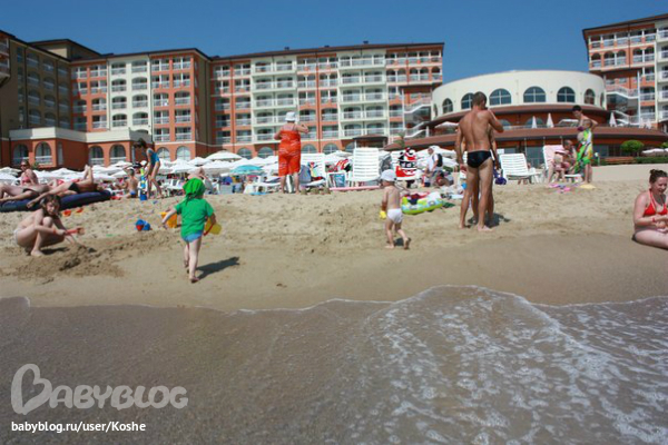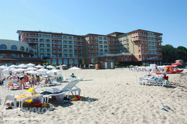 Отдыхали с подругой и двумя 2х годовалыми детьми. Отель действительно семейный. Жизнь в отеле идет по детскому расписанию. Анимация для детей на высшем уровне. Аниматоры в течении дня занимаются детками.Мы были с 15 по 29 июня. Погода не подвела. Заход в море, как и сам пляж полностью для деток, песчаный чистый пляж. Размещение очень удачное, брали вид на город и не пожалели, т.к. окна выходили на лес и вечером чувствовался запах елок. А утром не пекло в номер. Брали мы номер сьют, для двух семей достойный вариант. Ну, а если надоест сидеть в отеле, то можно съездить в обзор. Такси стоит 10лев, а вот ездил автобус, но мы его не ловили по расписанию, стоит 2лева. Курс в отеле 1,6 лев за евро, в городе почти 2. Цена отеля считаю очень конкурента той же Турции, но вот мало вероятно встретить быдло из глубинок. Да, еще есть один накол, в магазинчиках при отеле, все дороже на 20%, чем в обзоре и они частенько меняют ценит, говорят , что цена не в лев, а в евро, хотя ценник там стоял в лев! Еще один момент, но это не к отелю, а к страховой. Заболел мой сын, страховка ингоса, вызвали врача, педиатр говорит по русски и очень очень квалифицированный спец. Все затраты на телефон и оплату лекарств, страховая возместила. А вот врач при отеле, не знаю какой он квалификации, но по русски и по английски, он говорит как таджик на тех же самых языках.