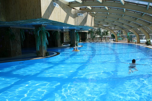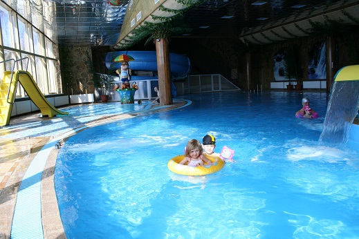 В главном корпусе на 1 этаже. 2 взрослых + 1 детский. 2 горки. Заход в воду - большие широкие ступени. Дочке нравилось на них сидеть и играть с водой. Спасатель один, ходит и смотрит, но не активно. Весь контроль на родителях. Пожалела, что не взяла дочке халат, между бассейнами прохладно.