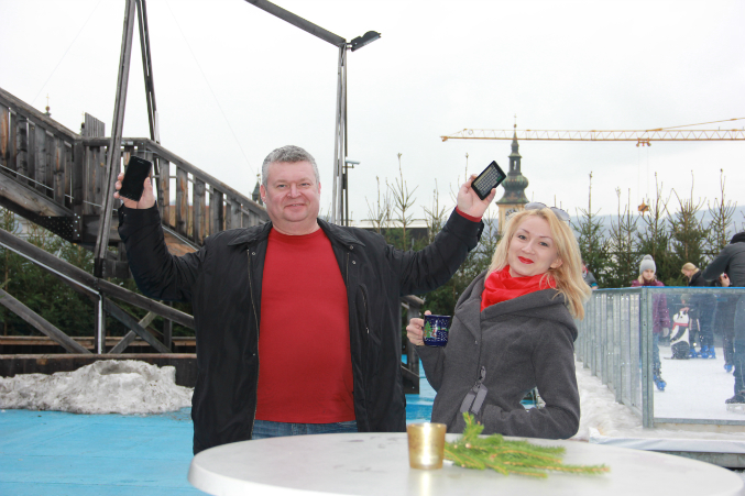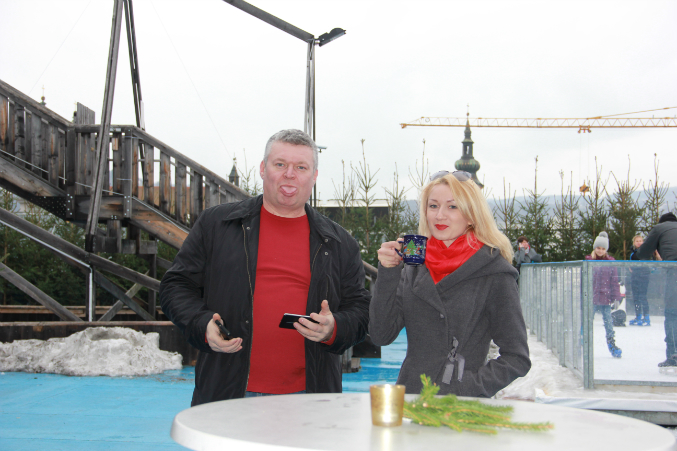 Зашли в спортивный магазин и накупили разных лыжных причендалов и спросили как добраться до злополучных "мостиков". Здесь мы услышали прекрасную новость: МОСТИКИ ОТКРЫТЫ ДЛЯ ПОСЕЩЕНИЯ ТОЛЬКО В ТЕПЛОЕ ВРЕМЯ ГОДА! Никогда зимой по ним ходить нелься, чтобы не подскользнуться и не свалиться вниз! Вот так да!!! Мы ехали в такую даль из-за рождественских мостиков ))))) Эх, Маша, Вова (советчики)! Удивившись, но не слишком расстроившись, вы полезли-таки на крышу, посмотреть как это выглядит поближе. На крыше нас ждал приятный сюрприз. Здесь был организован небольшой ледовый каток и наставлены сосны. А еще продавали глинтвейн. Глинтвейн вообще ассоциируется у меня со всякими приятностями. Мы с Андреем заняли один из украшеных рождественской экибаной, столик, заказали по бокальчику согревающего напитка.