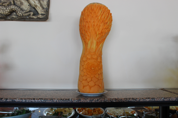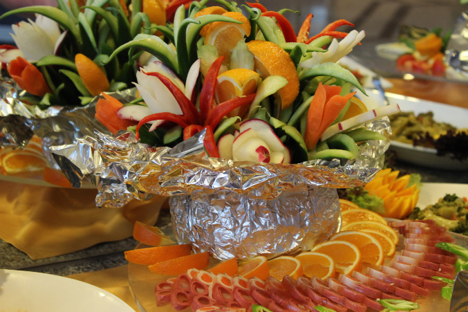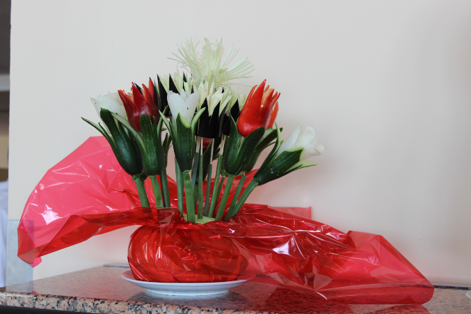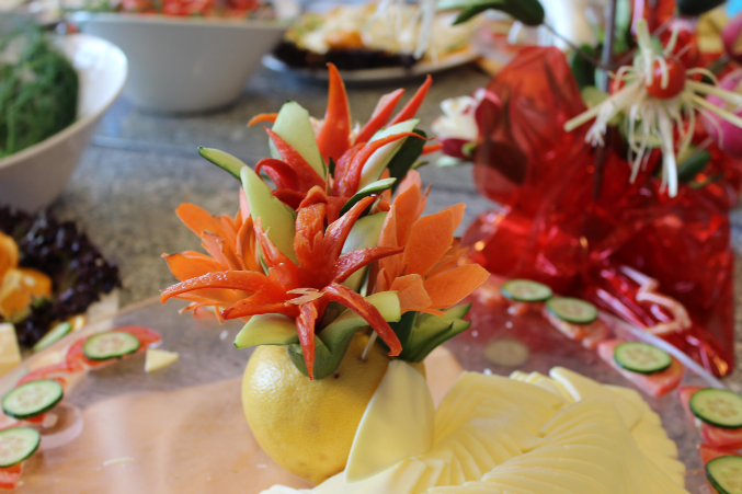 Скульптура из огурцов и розочки из редиски.