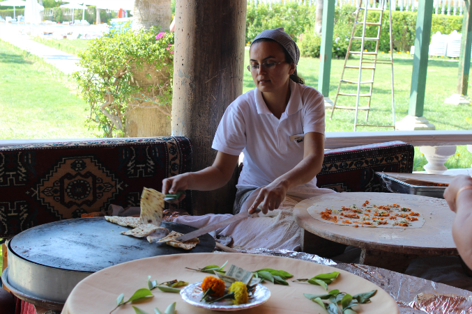 Каждое утро на пляже девушка пекла лепешки с начинками для отдыхающих! Как она ловко управлялась с тестом! За секунду из комочка теста раскатывался тонюсенький огромный пласт
