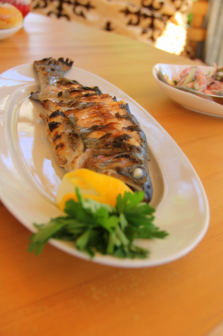 Предложили форель, которую сама же и поймала в бассейне расположенного здесь форелевого хозяйства. Свежайшая рыба и бокал белого вина...
