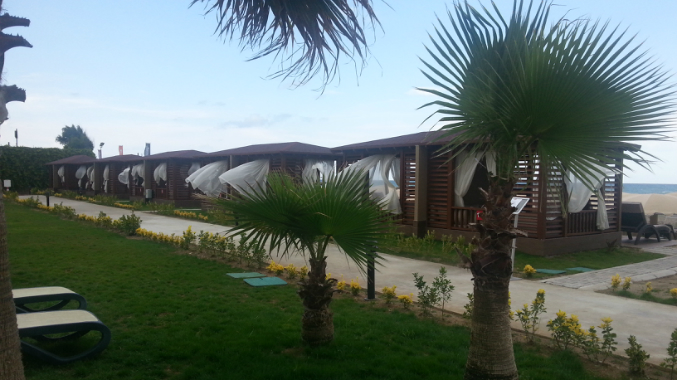 Очень красивая территория, один раз видели белку))). По дороге к морю между бунгало встречаются беседки. Так же по территории курсирует а-ля маршрутка, ходит вроде каждые 15 мин. На ней как раз очень удобно добираться от моря до горок, детского клуба Pino. В глубине отеля есть небольшой релакс бассейн и рядом же небольшой барчик, напитки крепкие в нем не наливают. Рядом с ним есть корт.