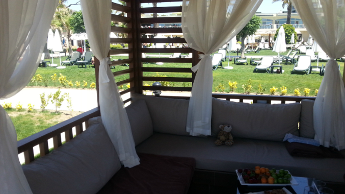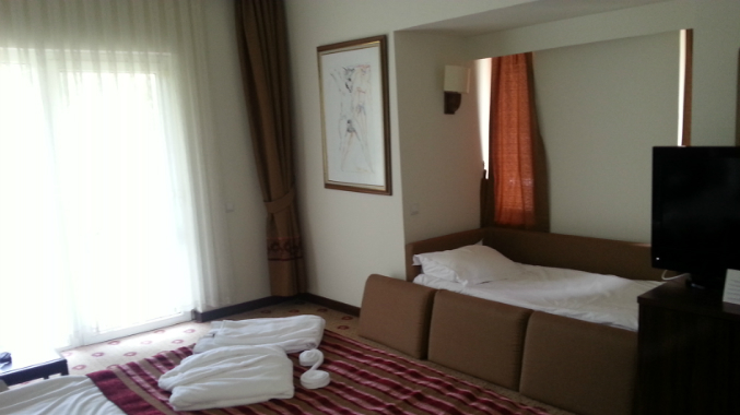 Встретил нас Anex tour очень радушно. От аэропорта до отеля ехали 40мин (наш отель был 4ый).В отеле были около 10 утра. По приезду нас очень, повторюсь очень быстро расселили в бунгало. Нам очень понравился, это второй корпус №3467 находится недалеко от главного ресторана и моря, шума никакого не было (некоторые бунгало- окна выходят на дорогу) на балконе все стандартно стол со стульями и что еще понравилось высокие потолки (жили на 2м этаже). В номере огромная кровать, маленький диванчик, кушетка на которой спала дочь. Есть халаты,тапочки из косметических принадлежностей зуб щетка, паста, расчески, бритвы... Wi Fi в номере ловит неплохо. Через какое то время позвонили с рецепшена и поинтересовались все ли хорошо. А еще позже принесли вазу с фруктами и вином. Кстати когда заехали в номер, там уже стояла детская кроватка, а еще можно взять на прокат коляску (по моему под депозит 100$ , точно не скажу слышала из рассказов и горшок)). Бар пополняется ежедневно с 9-16:00 (чай хол, 2 бут минералки, 2 с газом, 2 кока колы, 2 пива, 2 пакетика молока). Полотенца меняют ежедневно.