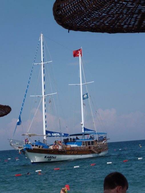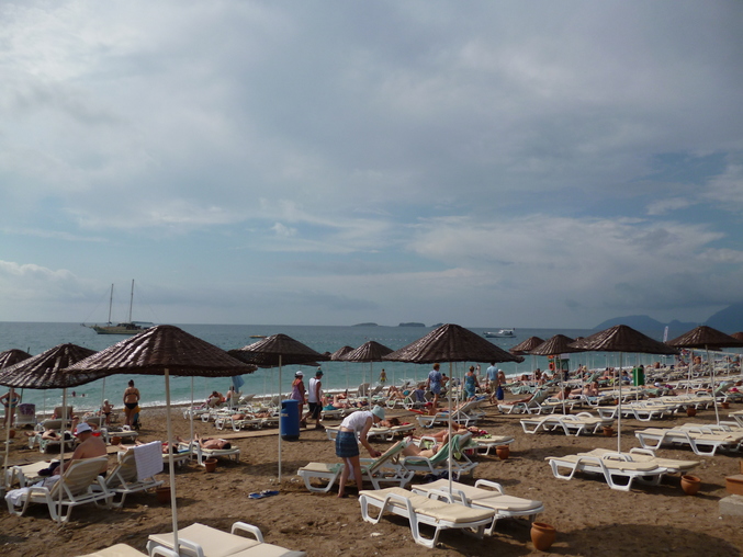 На пляже вход в море- галька.... Это самое неприятное из всего отдыха - зайти в море и не переломать ноги - надо умудриться)) Но хотя в этом регионе - везде так, в Кемере тоже галька. В общем совет - купите резиновые кеды, они стоят 10-15$ и не мучайтесь весь отдых! Вода - чистейшая! Соленая! Моя мама не умеющая плавать полюбила там полоскаться, т.к. вода очень хорошо держит и даже выталкивает. Развлечение на пляже все есть: парасалинг, банан, катер, лыжи, ну в общем все, что душе угодно. Приятно, что на пляже НЕТ СРАЧА. Каждое утро убирают и ровняют песко-гальковый пляж, у каждого шезлонга стоит горшочек для мусора.