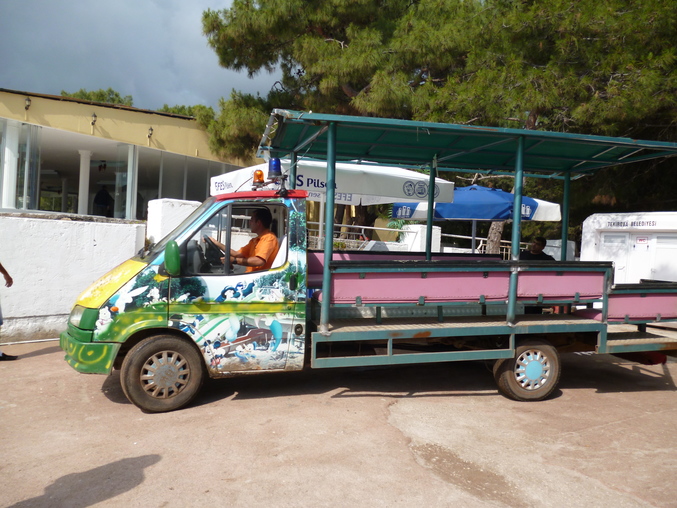 Приступим к пляжу! До пляжа нужно идти метров 400-500, минут 5 пешком, но для особо ленивых туда ходит трамвайчик, очень часто!))) Веселый паровозик с розовыми сиденьями)