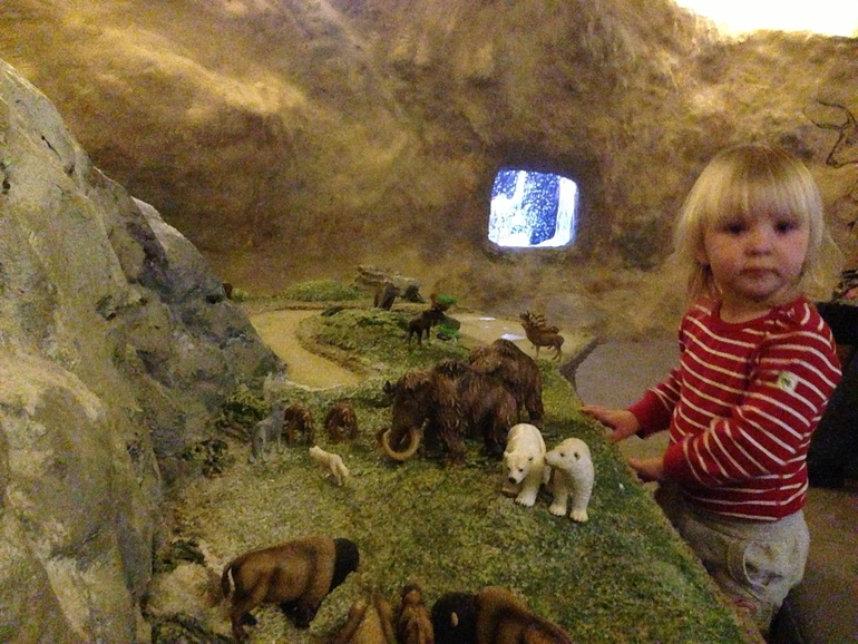 Ну и детская игровая пещера нам очень даже приглянулась. В ней можно провести раскопки в песочнице, потренироваться в наскальной живописи и просто поиграть с фигурками животных ледникового периода.