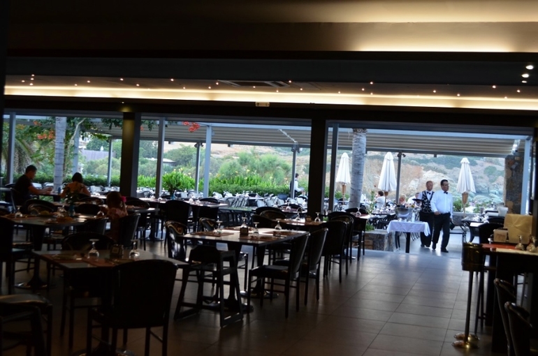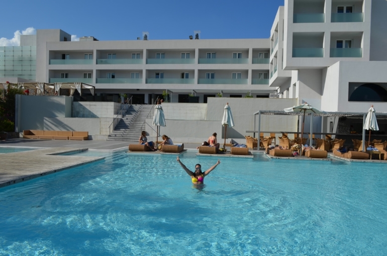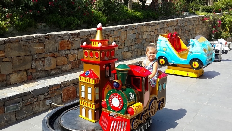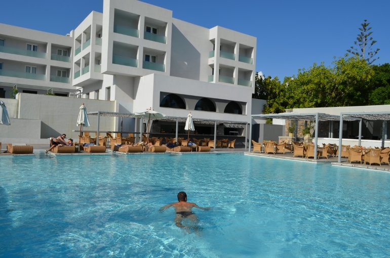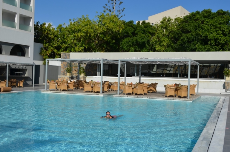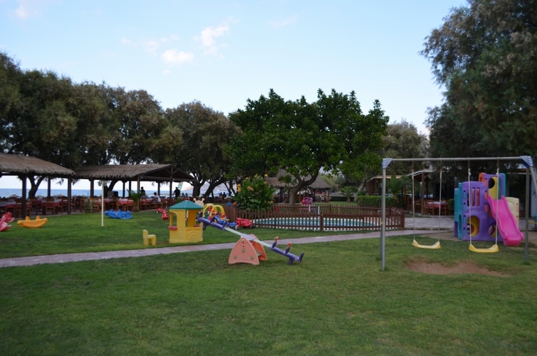 Сеть отеля Capsis Elite Resort 5* состоит из трех корпусов это Capsis Ruby Red там где ресепшен из красного мрамора в классическом стиле, второй корпус Capsis Crystal там где ресторан и корпуса со стеклянными балконами и вид на бассейн и море, корпус в стиле модерн и третий корпус Capsis Elite виллы с видом на пляж, это отдельные домики и все эти корпуса стоят на одной территории. Отель нам очень понравился, реально придраться не к чему, да есть там пару косяков с ремонтом, но это такие мелочи! В отеле есть большой бассейн с морской водой, рядом бар. В отеле есть бутики с одежной и шубами, но цены там как и в любом отеле дорогие. В отеле есть для детей целый CAPSIS Minoan Amusement Park парк развлечений, где для детей с 4до 7 лет обед бесплатно и можно без присмотра родителей оставить своего ребенка. В корпусе есть бассейн с шарами, горки, батут, домики и много всего для занятия ребенка. По вечерам каждый день кроме воскресенья была для детей любого возраста дискотека, где детки с аниматорами танцуют под музыку и играют в игры, начинается дискотека в 20 часов вечера и длится 30 минут, потом аниматоры рисуют на лице или руках ребенка все что они пожелают! Одним словом скучно детям не будет. На территории отеля для детей нет ни чего кроме паровоза и машинок просто двигающихся и то стоят они 1 евро. У отеля есть два пляжа, один закрытый только для отдыхающих отеля с черной мелкой галькой. А второй совмещен с общественным пляжем деревушки Агия Пелагия с белым песком. Рядом с отелем есть деревушка Агия Пелагия, где есть много магазинчиков, супер макетов и таверн вдоль моря, где вы всегда можете пообедать. Мы на обед заказывали суп дочке, муж заказывал окуня, кофе и пиццу отдали 30 евро. Из отеля вы можете выходить и заходить в любое время не предоставляя каких лидо документов и даже загонять на территорию отеля на парковку ваш автомобиль взятый на прокат на несколько дней. Рядом с отелем есть автобусная остановка откуда вы можете уехать за 3,5 евро до Ираклиона за покупками.