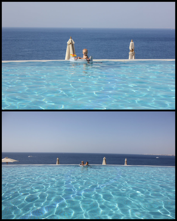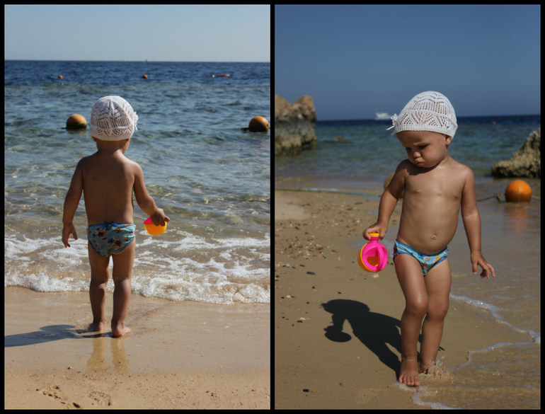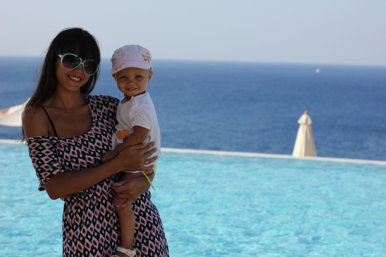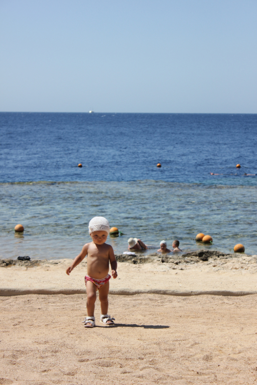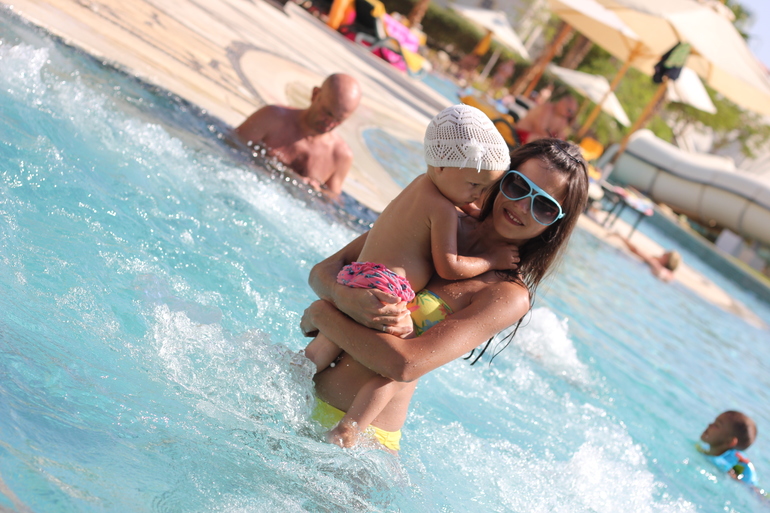 Вылет в 7 утра, в аэропорт надо было выезжать в 3, а у Карины поднялась температура 38! Я конечно же совсем не спала, уже думала не ехать или мужа одного отправить, но мы отважные)) набрали сумку еды и лекарств)) Перелет конечно же не легкий, а что делать, поочереди держали нашу малышку на руках. Когда приехали в отель, нас сразу же разместили, потому что номер делюкс. Стоило Карине искупаться в море, как болезнь рукой сняло! Научилась говорить море куп-куп, мама я сама, идем-идем)) и еще много всего)