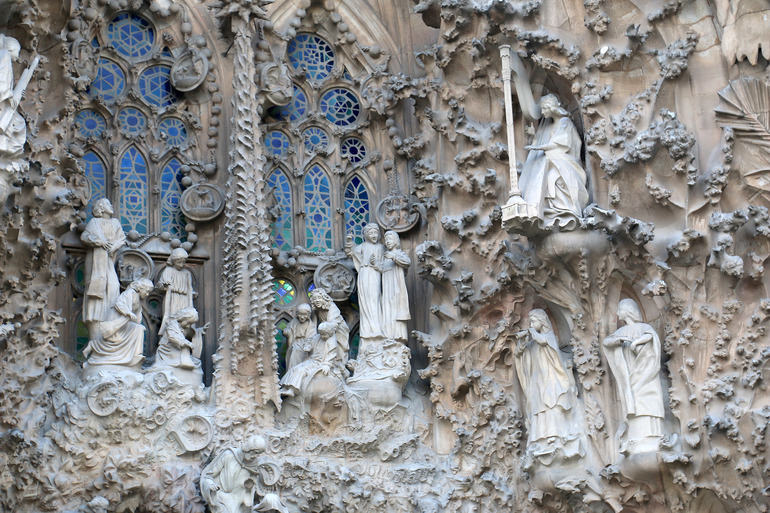 Фасал «Рождества» прославляет три христианские добродетели: Веру, Надежду, Милосердие. Скульптуры посвящены земной жизни Христа. Башни-колокольни, напоминающие песчаные замки, содержат винтовые лестницы внутри. Каждая башня посвящена своему апостолу, статуи которых помещены в точках изменения формы башен от квадратного к круглому сечению. Главные врата фасада Страстей украшены цитатами из на нескольких языках, включая . Фасад Славы предполагается украсить словами .