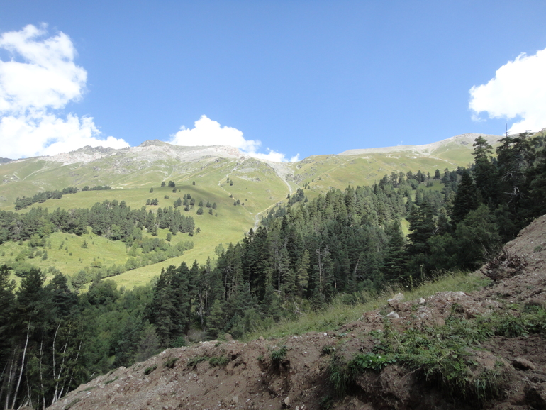 В планах было доехать до Романтика и на канатке подняться в горы, а потом дальше пешком. Но канатка не работала, рабочие повредили электрический кабель. Поэтому мы на машине доехали до Лунной поляны и немного поднялись вверх. Так как канатка продолжает строиться, вверх проложена дорога для рабочей техники. Вот на фото ее хорошо видно: