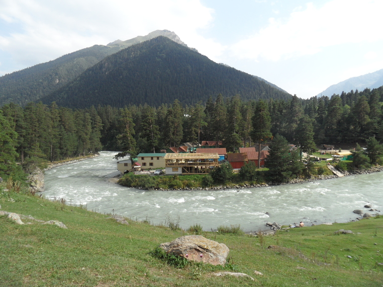 Вид на нашу турбазу "Огонек" с противоположного берега реки Зеленчук. Видны новые корпуса, которые построила одна из хозяек. Цены там в 2 раза выше, чем мы жили))