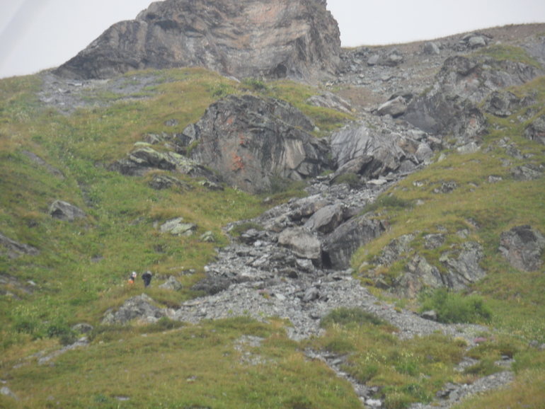 Распогодилось к обеду. Муж и кума решили пойти на перевал налегке. Самый трудный отрезок пути вот эта узенькая, очень крутая тропка: