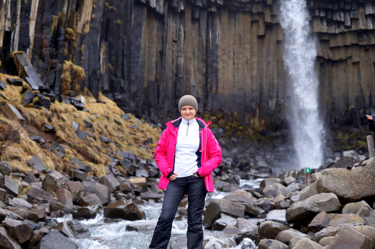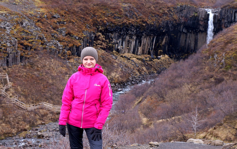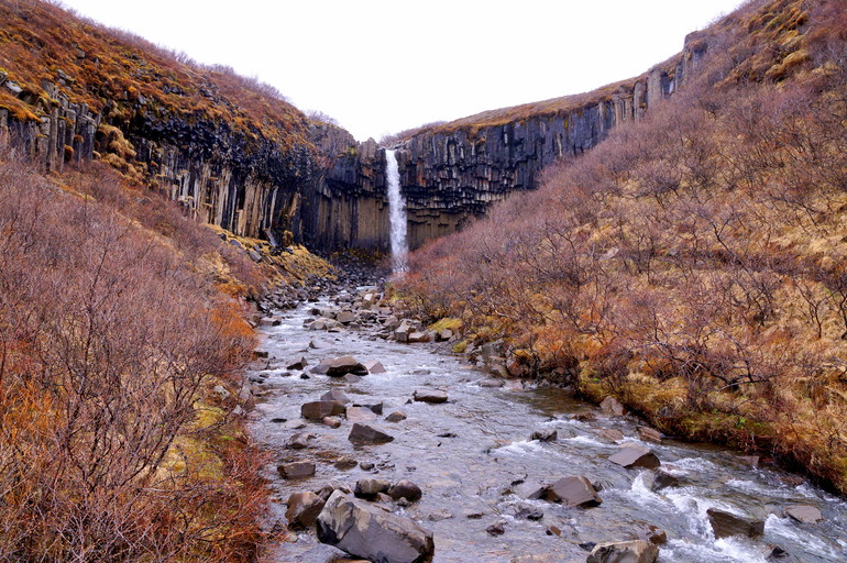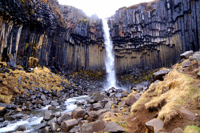 Свартифосс падает с 12-метровой высоты и окружен уникальными шестигранными колоннами из черной лавы, откуда и получил название «черный водопад» или «черное падение».