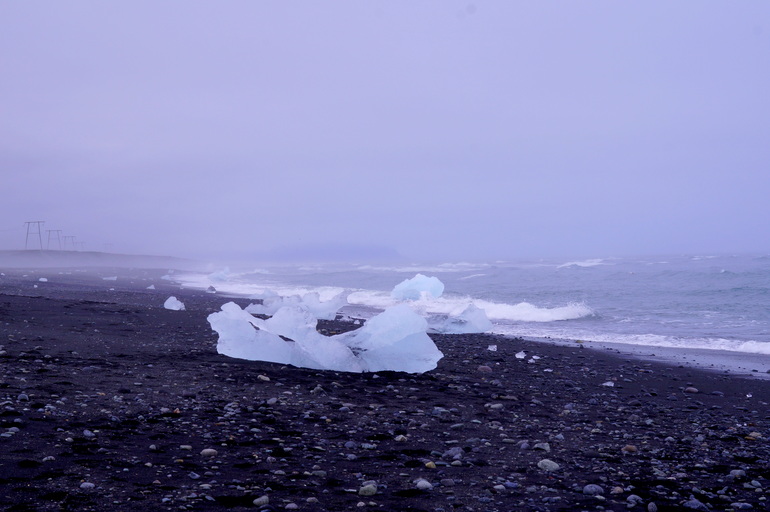 А между тем уже слышен шум океана. Черный песок и камни, глыбы снега и прозрачного льда, выброшенные на берег, стремительно накатывающие волны и крики чаек...
