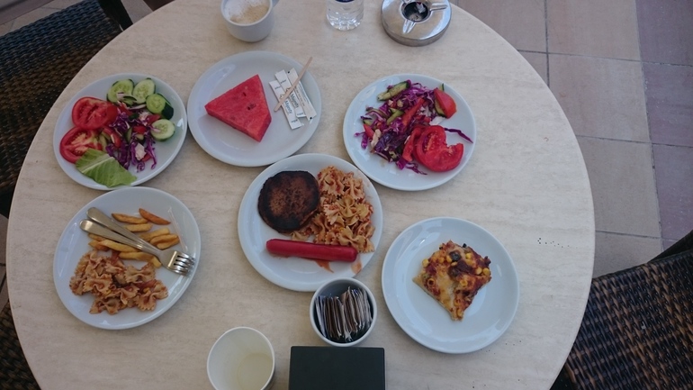 мы прошли нехитрую регистрацию на ресепшне и пошли завтракать, покуда заселение в отель в 14-00,а время на часах было 07-30. ну что я скажу, мы-люди непривычные к такому изобилию (читать нищеброды) и мы были повергнуты в легкий шок, что можно подходить и все брать,сколько душе угодно))))