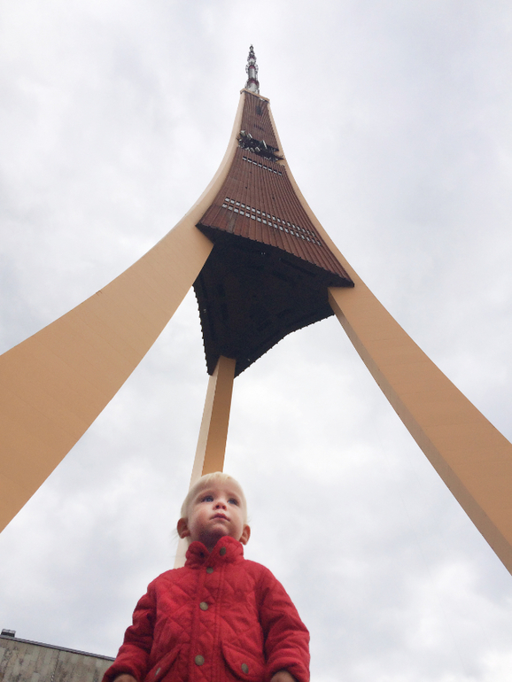 Дальше было наше путешествие на телевышку. Это одна из самых известных достопримечательностей города. Телевышка в Риге стоит на острове Закюсала и при высоте 368 метров до сих пор считается самой длинной в ЕС и третьей по высоте в Европе (после Останкинской и Киевской). За 40 секунд на скоростном лифте, одном из двух, расположенных в «ногах» башни, можно подняться на смотровую площадку на высоте 97 метров. Это самое высокое место в городе, куда могут забраться туристы.