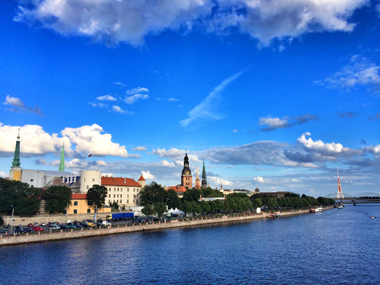 Наш очень милый 4* отельчик с видом на старую Ригу и Даугаву. Вроде бы находится в зеленом, тихом месте, но с другой стороны -переход через мост- и ты прямо в самом центре старого города.