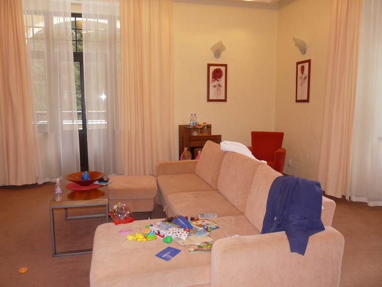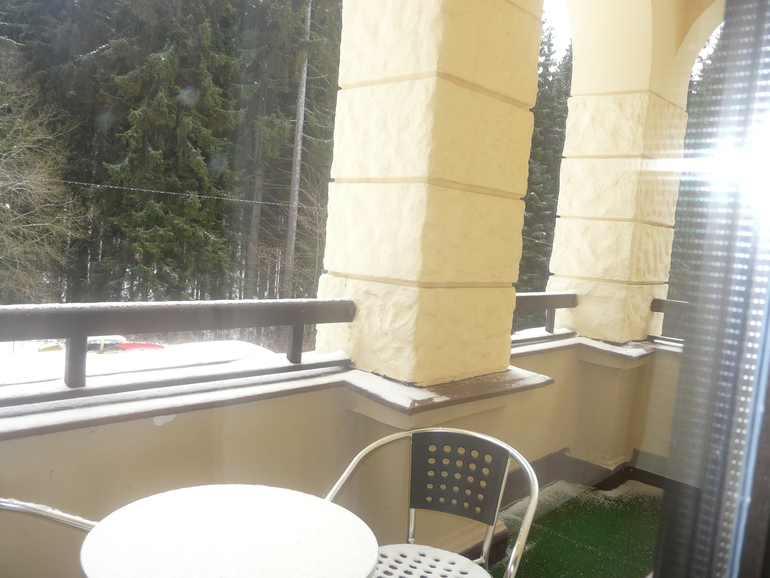 Отель находится в лесу...кругом тишина, запах леса и свежий воздух...дальше нашего отеля есть только один отель и все...конечно кому в тягость ходить в гору небольшую и от Колоннады не близко....но мы ориентировались на долгие прогулки, т.к. там зима +5, гуляли мы по 2-3 часа на коляски, снег белоснежный, хотя когда мы приехали его не было совсем...дней через пять пошел.... там очень красиво..У нас был номер аппартаменты комната, зал, прихожая, ванная с туалетом. Очень удобно с коляской, они на первом этаже