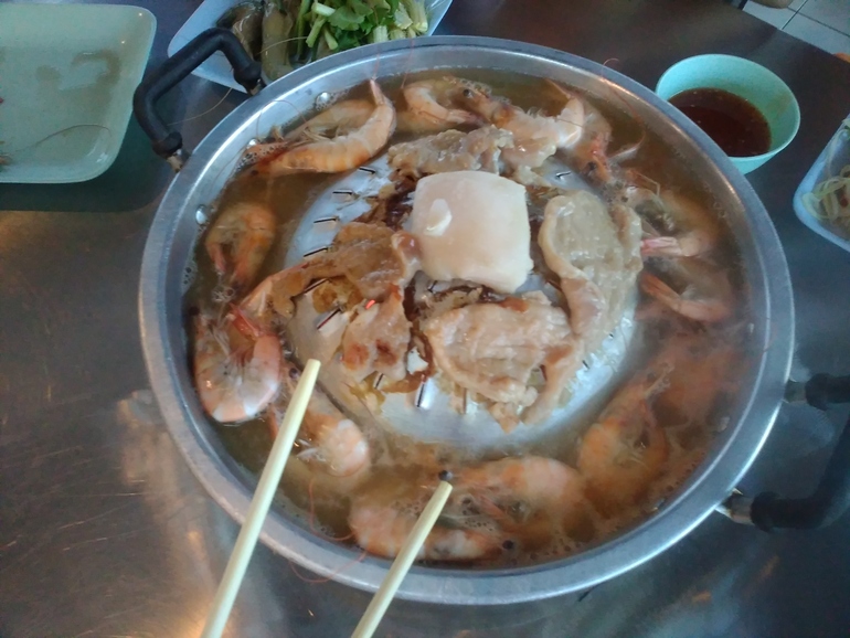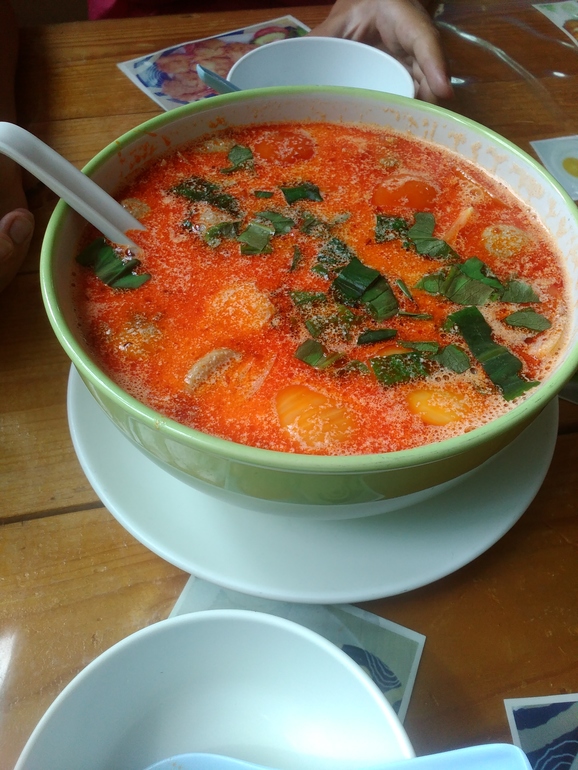 Рядом с Кондо с макашницы распробовали вот такой супчик.Очень понравился.Ели его потом несколько раз. По русски написано название-свинина барбекю ,яичная лапша и пельмени(суп).Пельмени оказались с сосиской.Тесто вкусное,похоже на наше,сосиска тоже вкусная.Все вместе отлично сочетается.На столе всегда специи можно сделать блюдо по острее,по кислее,добавить орешки ,соль или сахар.