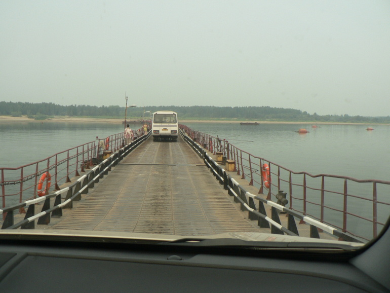 По понтонному мосту, опасно качающемуся и недоступному в разное межсезонье (и тогда городок реально отрезан от мира),