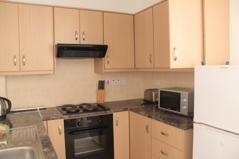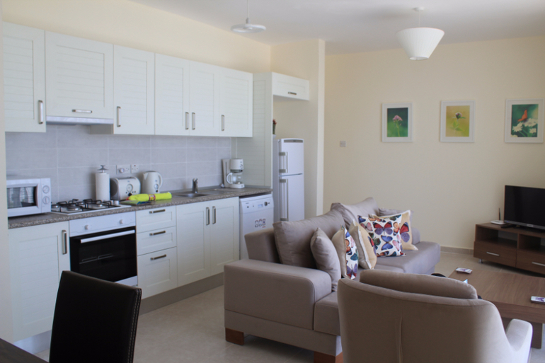 Сами аппарты неплохие, просторные, на кухне все что надо. Кухня-гостиная, две спальни, балкон или терраса (если на 1 этаже). Большой плюс - наличие парковочного места, включенного в стоимость апартов - не надо думать, куда приткнуть машину. Ресепшн тут нет, поэтому с хозяином надо связываться заранее, чтобы он вас ждал на месте.