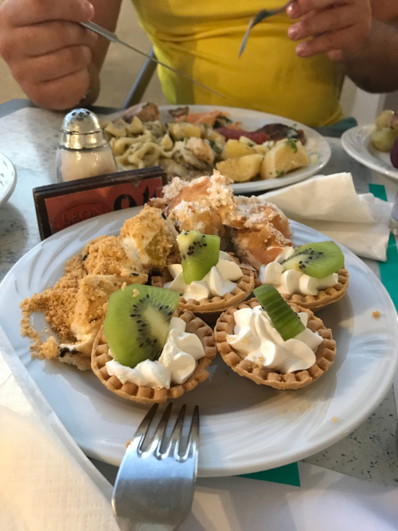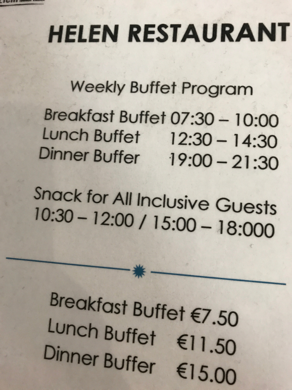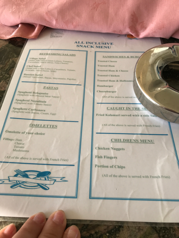 Когда выбирали этот отель, то не могла вообще найти ни какой информации про питание в отеле, просто писали что голодными не оставались. И вот мы увидели какое питание в отеле и вам кидаю видео обзор завтрака , обеда и ужина и это питание только в один из дней, каждый день что то новенькое. В прошлом году были в другом отеле Avlida и да там питание было разнообразней и больше выбор, но зато в том отеле нет такого вида и близости к морю! Питание в отеле Eleni Holiday Village 4* на твердую 4! Правильно в отзывах пишут голодными не оставались! Каждый день по три вида мяса курица, баранина, утка, говядина, ребра свиные. Рыба каждый день или морские коктейли. Для детей конечно не густо нагинсы, хлопья с молоком, но наша дочка 1,9 года ела все что ели и мы и ни аллергии ни чего не было, все вкусное и свежее! Из фруктов сливы, яблоки, грейпфрут, апельсин, лайм, арбуз и дыня были два раза в неделю, виноград, персик редко. Десертов стоит три вида и каждый день менялся. По поводу бара, все как везде разведенные соки, яркие коктейли ни чего нового все вкусное и холодное в такую жару. Младшей дочке 1,9 года везли с собой сок детский, а старшая 7 лет пила с бара детские коктейли и соки. В отеле еще есть Пул бар у бассейна там коктейльное меню такое же что и у ресторана. В пул баре с 10 часов не ограниченное количество МОРОЖЕННОГО трех видов для тех у кого все включено. С 15 часов до 17:45 можно перекусить бесплатно если у вас все вкл. Паста 4 вида, чизбургеры, гамбургеры с картошкой фри, салаты разные. Если вы хотите покушать и у вас не все включено, то с 10-17:45 можно там покушать платно. И так сделаем вывод еда вкусная, свежая, не совсем разнообразная, но всегда сыты и довольны, ставлю твердую 4! Главное что взрослые что дети ни разу не жаловались на боли или прочее в животе и не было аллергии.