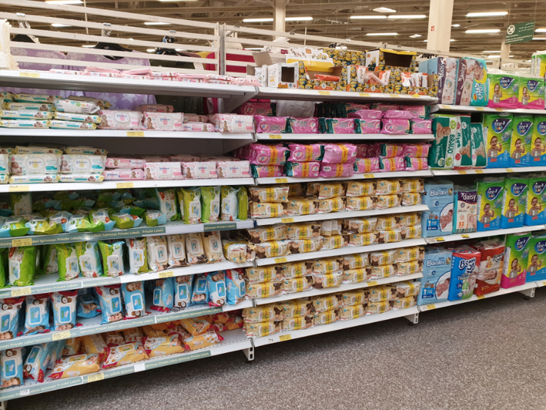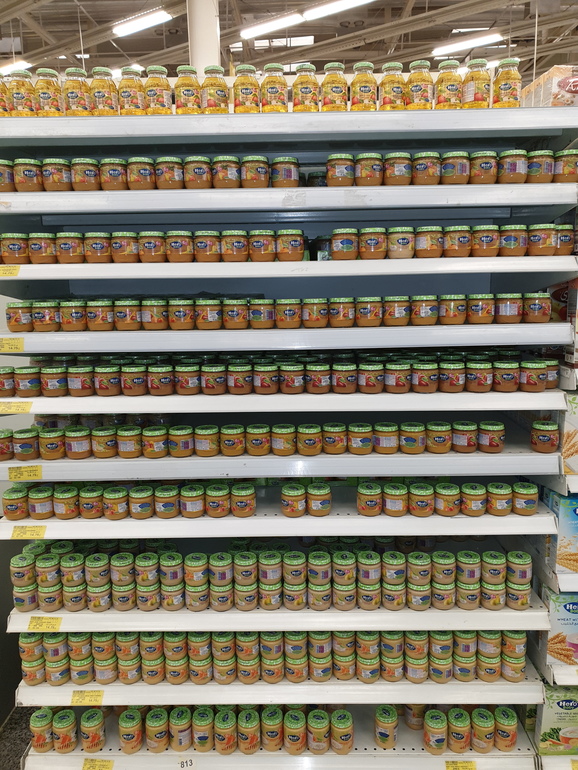 скидываю фото что там есть для ребенка.А есть там все из средств гигиены,а вот с питанием-только фруктовые банки.В аптеках есть так же все-памперсы,пюрехи фруктовые,присыпки,крема,салфетки....