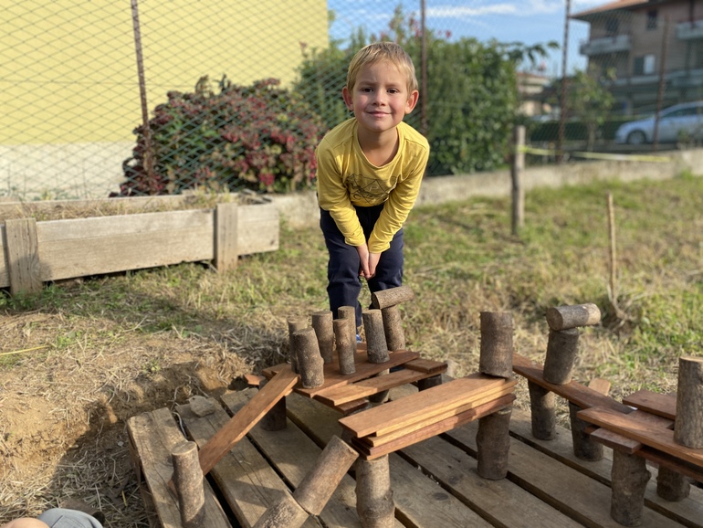 Мы начали с игр: покидали колечки на колья, затем занялись строительством динозавров из деревянных брусочков и досточек.