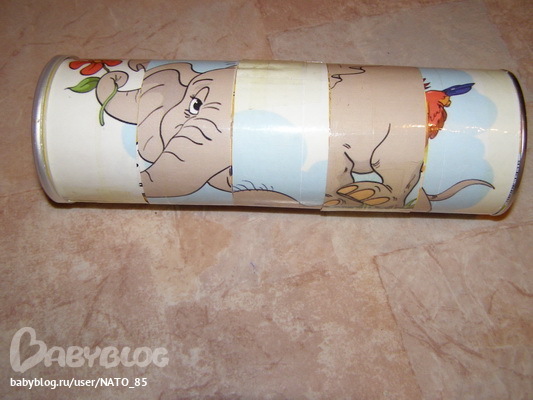 Попробую объяснить.... С самой банкой делать ничего не надо. Получается мы просто разрезали картинку на несколько полосок, потом брали попорядку каждую полоску, обматывали вокруг баночки (внатяг) и стык склеивали скотчем, получается, что картинка держится сама по себе вокруг банки, но снять ее ребенок не может, так как по краям ограничители (расширение - дно и горлышко). И так склеивали все полоски. Получилось что одна на другую не наезжают, а просто крутятся вокруг банки. Как - то так...
