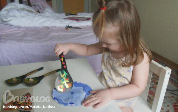 Сегодня хохолма. Мы взяли черный плотный картон, вырезали ложку. Я нарезала травки зеленого и желтого цвета, красные кружки рябины и из золотого картона (оставался кстати еще от приглашения на свадьбу!) листочки. Достали бабушкины ложки и сделали свою. А потом ели ею из нашей тарелки под гжель)))