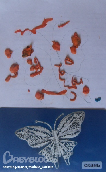 Мы взяли карточку, прочитали, посмотрели. Узнали, что скань бывает накладной, ажурной, объемной. Проволока используется простая и витая, а еще в нее добавляют «зернь» - шарики. Проволоки мы дома не нашли, зато катать колбаски из пластилина мы любим. Так что решили воспользоваться тем, что есть. Я нарисовала бабочку и мы катали кобласки, делали завитки и потом дочура отщипывала пластилин и украшала шариками – делала «зернь».