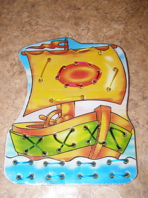 Потом еще и на картонку приклеила картинку рисунок кораблика (нашла на том же LI образцы с покупных наборов Волшебные веревочки). Дырочки сначала проткнула ножницами, а потом вбила люверсы (у меня не аппаратом, а просто палочка и молоток