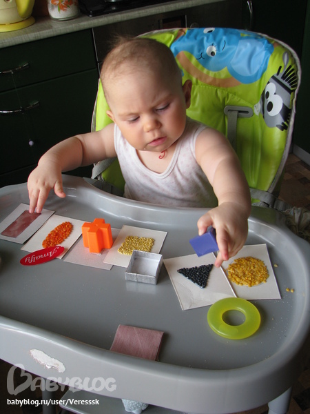 Подготовила сенсорные карточки с фигурами (фигуры выложены крупой и т.п. - имеют фактуру). На удивление, карточки живы до сих пор (отковырен только овал). Задание: я вытаскивала из коробки предметы, а Васене надо было найти карточку соответсвующей формы. Несколько раз угадала :) По крайней мере, ей понравилось!