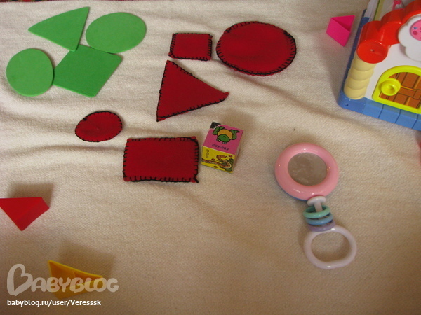 Давно смастерила что-то вроде фланелеграфа, только ткань не на твердой основе, а фигуры крепятся на липучках. С удивлением обнаружила, что Васена правильно называет круг, треугольник и квадрат. А также правильно разбирается в размерах.