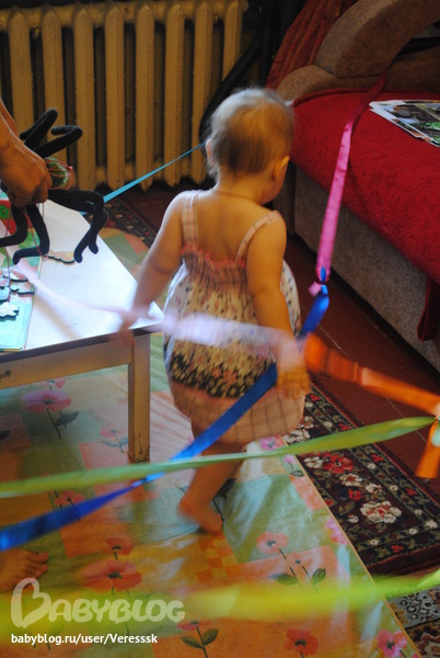 Нашли нашего паучка. Я объяснила, что паук живет в паутине, и, пока мы с Василисой рассматривали книгу "Теремок" с мягкими магнитами, Полина оплела всю комнату паутиной из разноцветных атласных ленточек. А потом паук гонялся за Василисой, а она удирала от него, пробираясь сквозь нашу "паутину" - перешагивая ленточки и пролезая между ними. Ей понравилось.