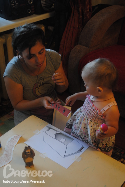 Затем мы перешли к практике. Заранее я подготовила дом, на который надо было наклеить крышу, стену, окно и крыльцо. Начала Васена бодро, но после стены как-то скисла и мы перешли к следующему пункту.