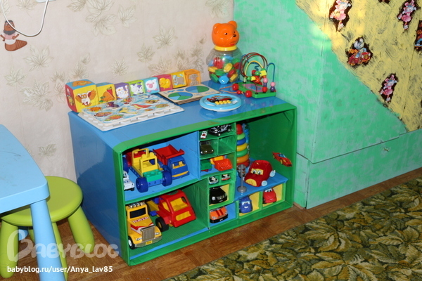 Поставили гараж рядом со шкафом с игрушками, где на полке тоже машинки, получилась единая конструкция...