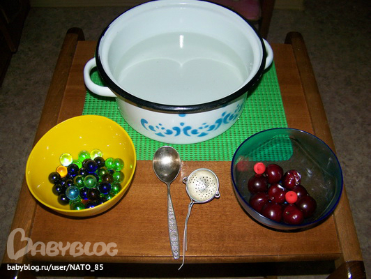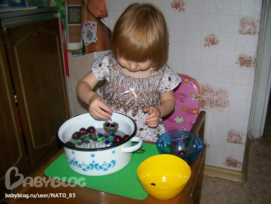 Варим компот (муляж черешни и декоративные стеклянные шарики), а заодно проверяем что тонет, а что нет.
