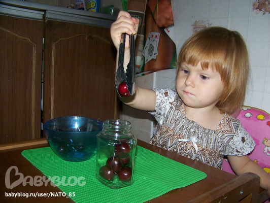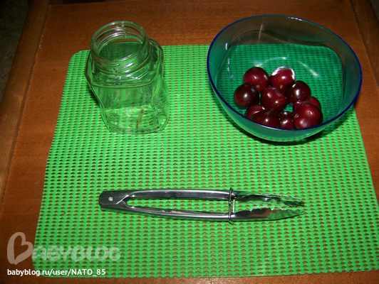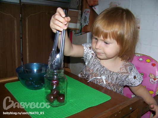 Перекладывали черешенки из мисочки в баночку, с помощью щипцов.