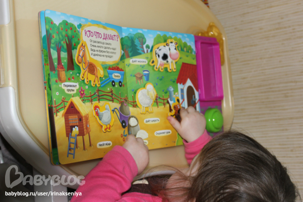 Наша дружная ферма-Азбукварик. Она у нас давно, практически каждый день играем, там голоса животных и картинки на липучках, на разворотах: кто где живет, кто что ест, у кого какой малыш. и стишки. Уже настолько ее выучили, что стали всех прилеплять на свои места