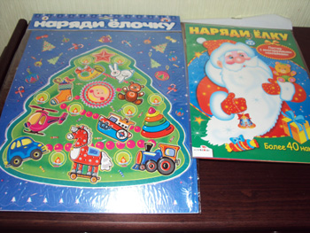 А правая елочка-это большоооой постер с красивой,большой елочкой и многоразовыми наклейками.