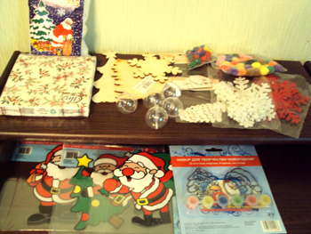 Это прикупленные нужности - наклейки на окна,снежинки для декора,искусственный снег,шарики