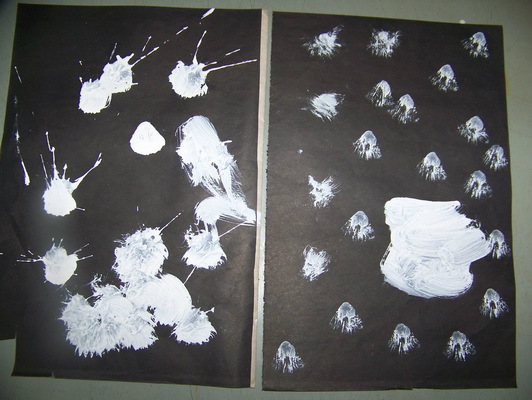 Вот что из нашего баловства получилось. Сначала Лиза решила рисовать метель и снег, причем фон выбрала сама и он оказался черным...